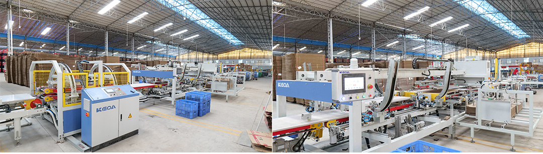 该包装线采用了爱游戏(中国)窑后整线统一的VI设计,并优化结构布局,让全线设备更简洁易用。该线在兼容多种产品规格的同时,具备一键式自动转产的功能,告别了过去手工调整的繁琐和低效,解决了客户的转产难题,辅以机器人自动码包系统,大大提高了生产效率。