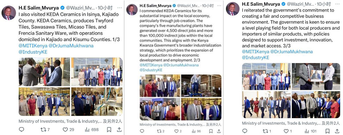 肯尼亚贸工部部长在参观考察后于社交媒体上连发多条动态,分享此次行程,并对特福国际对肯尼亚做出的就业和税收贡献大为赞赏和肯定。