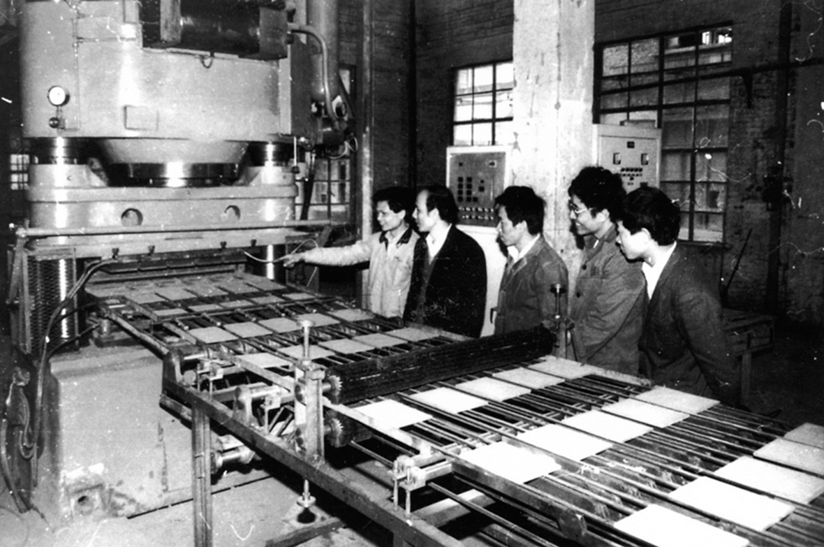 ▲YP600自动液压机于1988年12月25日在石湾建陶厂压出第一批彩釉砖。
