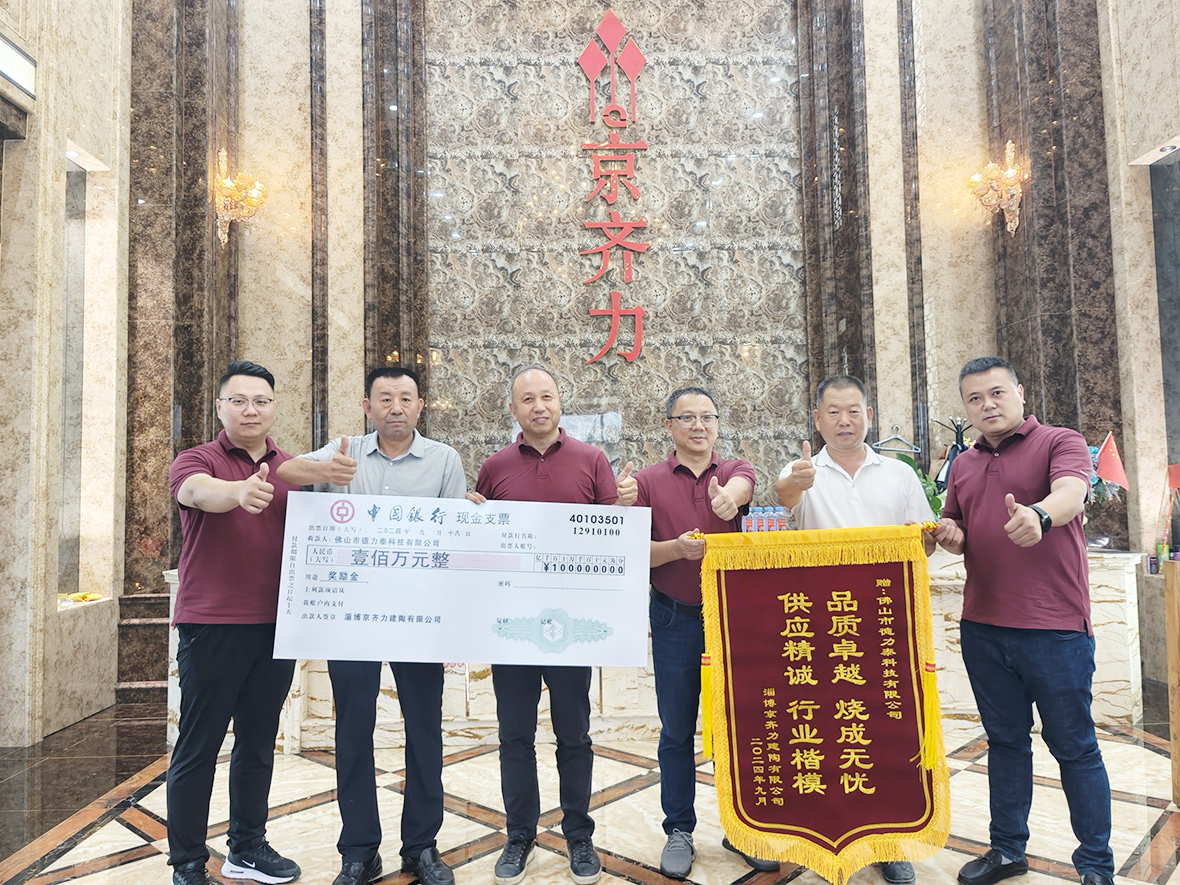 正是由于这条生产线在节能增效方面的突出表现,近日,京齐力陶瓷向力泰陶机赠送了锦旗以及节能达标后的100万元奖励,表达了其对力泰陶机智能整线的高度认可,信守承诺的京齐力陶瓷也因此赢得了广大供应商的信赖。