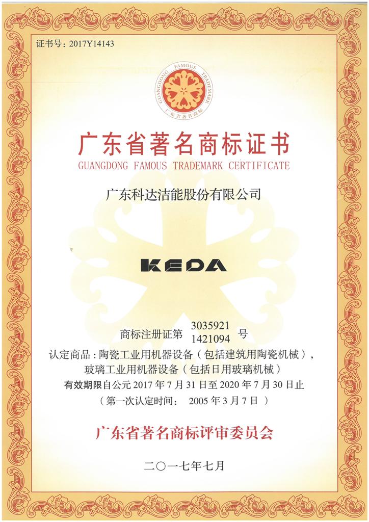 7月31日,广东省著名商标评审委员会发布了《2016年度广东省著名商标认定和延续公告》,近日,爱游戏(中国)洁能收到广东著名商标证书相关文件, “KEDA”品牌商标成功获得延续认定,有效期限自2017年7月31日至2020年7月30日止。