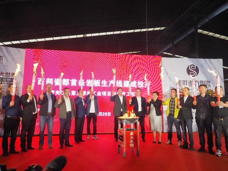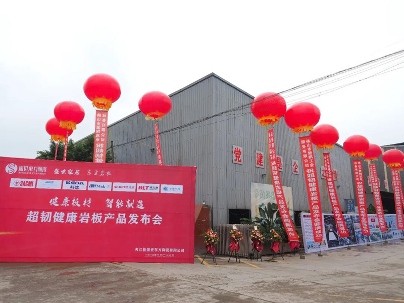日前,在举国上下喜迎新中国成立71周年华诞之际,夹江县盛世东方陶瓷有限公司(以下简称“盛世东方”)在其生产基地盛大举行了超韧健康岩板产品发布会。盛世东方董事长方海琼、夹江县政府领导,国内经销商、供应商合作伙伴及新闻媒体等数百人出席了发布会,共同见证盛世东方首条1200×2400(mm)岩板生产线建成投产的高光时刻。
