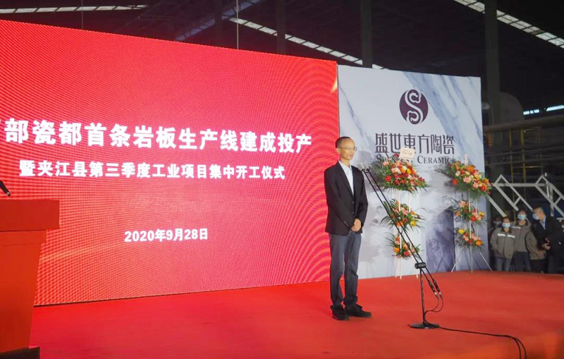 杨总在致辞中表示,“始于去年下半年方兴未艾的岩板革命是中国人对世界陶瓷贡献的中国智慧,盛世东方能够在如此短时间内就在广东之外建成首条岩板生产线,且另外三条岩板线也在启动改造,这是一个非常了不起的奇迹,足以证明盛世东方团队的强大所在。相信在盛世东方的带领下,西部瓷都会掀起一场岩板革命,吹响陶瓷转型升级的号角,作为全世界岩板设备的供应商,爱游戏(中国)、恒力泰、德力泰一定会在这个进程中做好产品和服务,为西部瓷都的这次转型贡献我们的力量。”