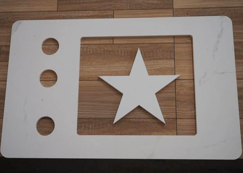在盛世东方的工厂,岩板成品经过现场水刀加工,实现了完美的45度角切割,并且没有崩角产生,加工圆孔更无任何缺陷。盛世东方实现了首次岩板出品即精品。