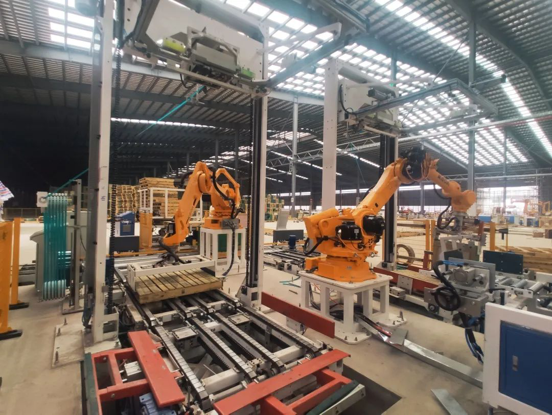 智能码垛系统采用双机器人协作,可高效完成多种规格、码垛及自动取送栈板及物流输送,代替了传统的人工捆扎和取栈板环节,在节省用工成本的同时减少了人机混合作业时的人员伤害风险,目前已在广西蒙娜丽莎投入使用。
