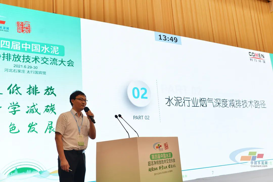 科行环保技术总监尹海滨向与会人员做《水泥窑烟气多污染物超低排放技术》汇报。为水泥行业烟气多污染物深度减排提供技术路径,介绍内容包括高温高/中尘、中温中尘、中温低尘技术的研发过程,各技术链的优势和适用条件,并对技术路径的选择提供了“科行建议”。