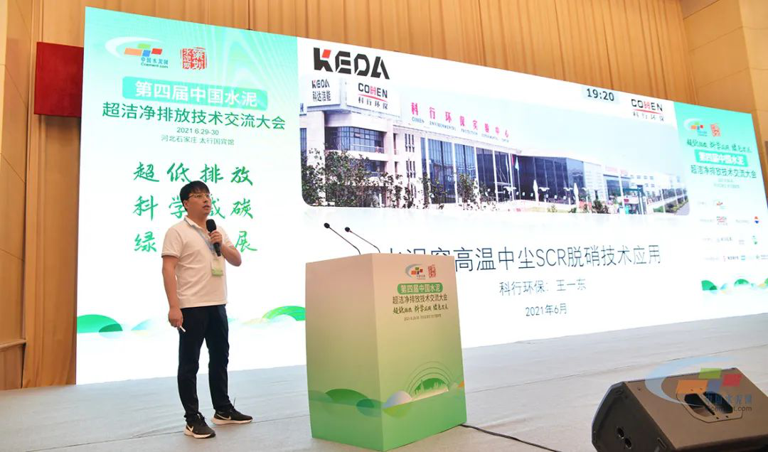 科行环保技术总监尹海滨作技术汇报 科行环保建材课题组组长王一东做《水泥窑高温中尘SCR脱硝技术应用》技术汇报。为与会人员分享了曲寨水泥4500t/d生产线NOx深度减排技术应用情况。该项目采用高温电除尘+SCR脱硝(高温中尘)工艺,在C1出口引出高温烟气,进入新建的高温电除尘器进行烟气除尘,经降尘的烟气再进入新建的SCR反应器进行脱硝反应,NOx排放浓度<50mg/Nm3,后进入余热锅炉进行余热利用。该技术使催化剂在中尘环境下运行,提高催化剂使用效果及寿命,在NOx排放达标的同时,更好地控制氨逃逸。