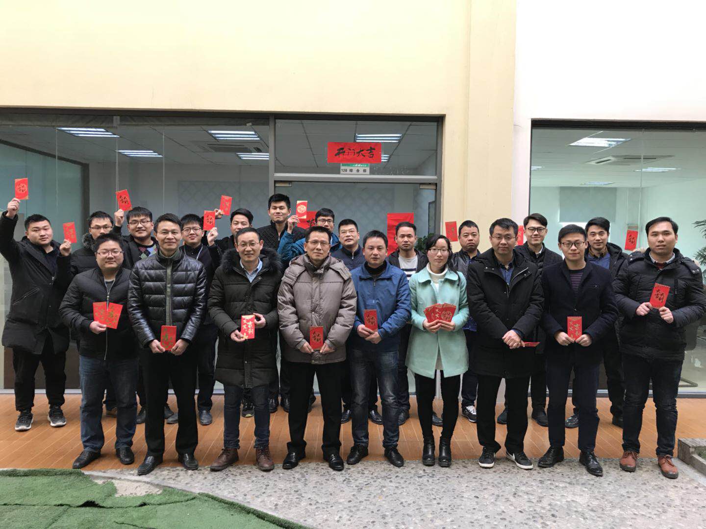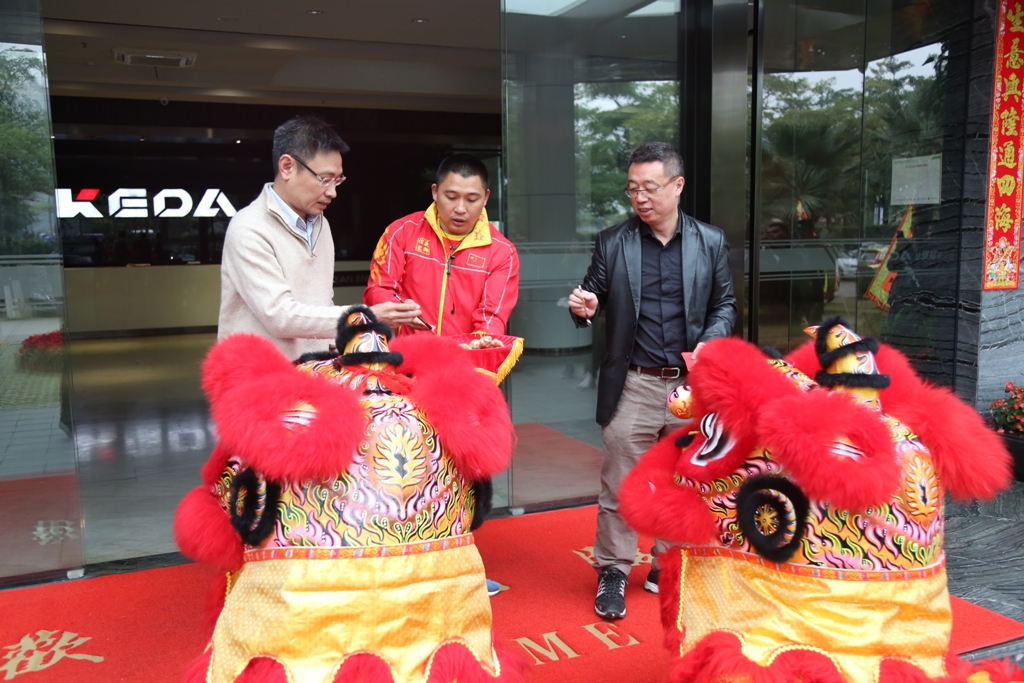 在公司总部三个厂区办公大楼,现场洋溢着欢声笑语,喜气洋洋,公司副总裁钟应洲、周鹏等高管代表公司向广大员工拜年,并为醒狮“点睛”,祥狮献瑞,醒狮吐出吉祥对联“大展宏图,财源广进”,随后几位领导接过醒狮采青,接财接福、财源滚滚。寓示着全体爱游戏(中国)人将以干劲满满,全新的姿态开启新一年的“奋斗”模式。