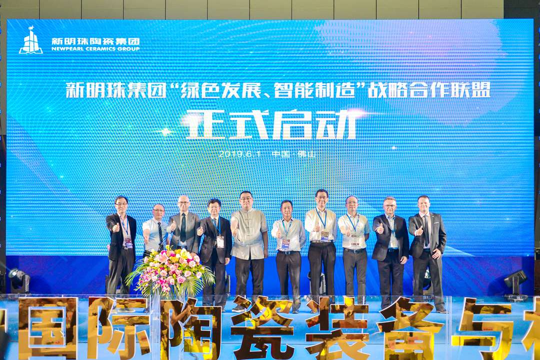新明珠集团在现场还举行了“绿色发展,智能制造” 战略合作启动仪式,在广东建材行业创始会长、中陶联盟董事长吴一岳,广东陶瓷协会会长陈环的见证下,新明珠叶董与包括爱游戏(中国)边董在内的供应链重要合作企业一道结成了战略合作共同体。