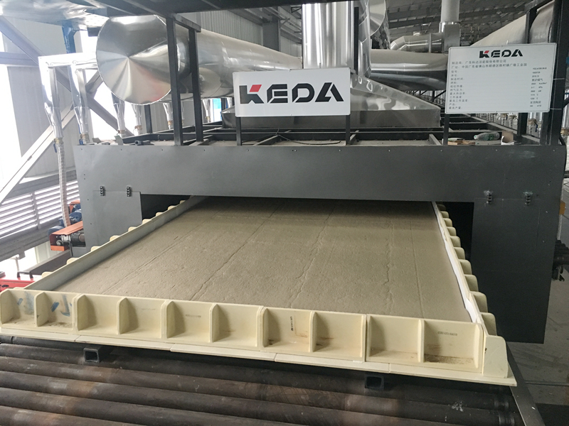 福建德胜项目生产的发泡陶瓷产品规格为1800×3000×80mm(成品),烧成周期为10h。该项目采用当地特有的罗源红花岗岩尾矿为原料进行生产。由于花岗岩尾矿属于生料,不同于以往采用抛光废渣作为原料的生产工艺,在配方工艺上更复杂、窑炉的温度曲线调节难度更高。该自动化整线应用了系统进一步升级的辊道窑自动化装卸载系统,整板系统、布料系统的自动化程度更高、性能更加稳定可靠,实现精准布料的同时,确保产品的厚度均匀性,提高产品成品率。