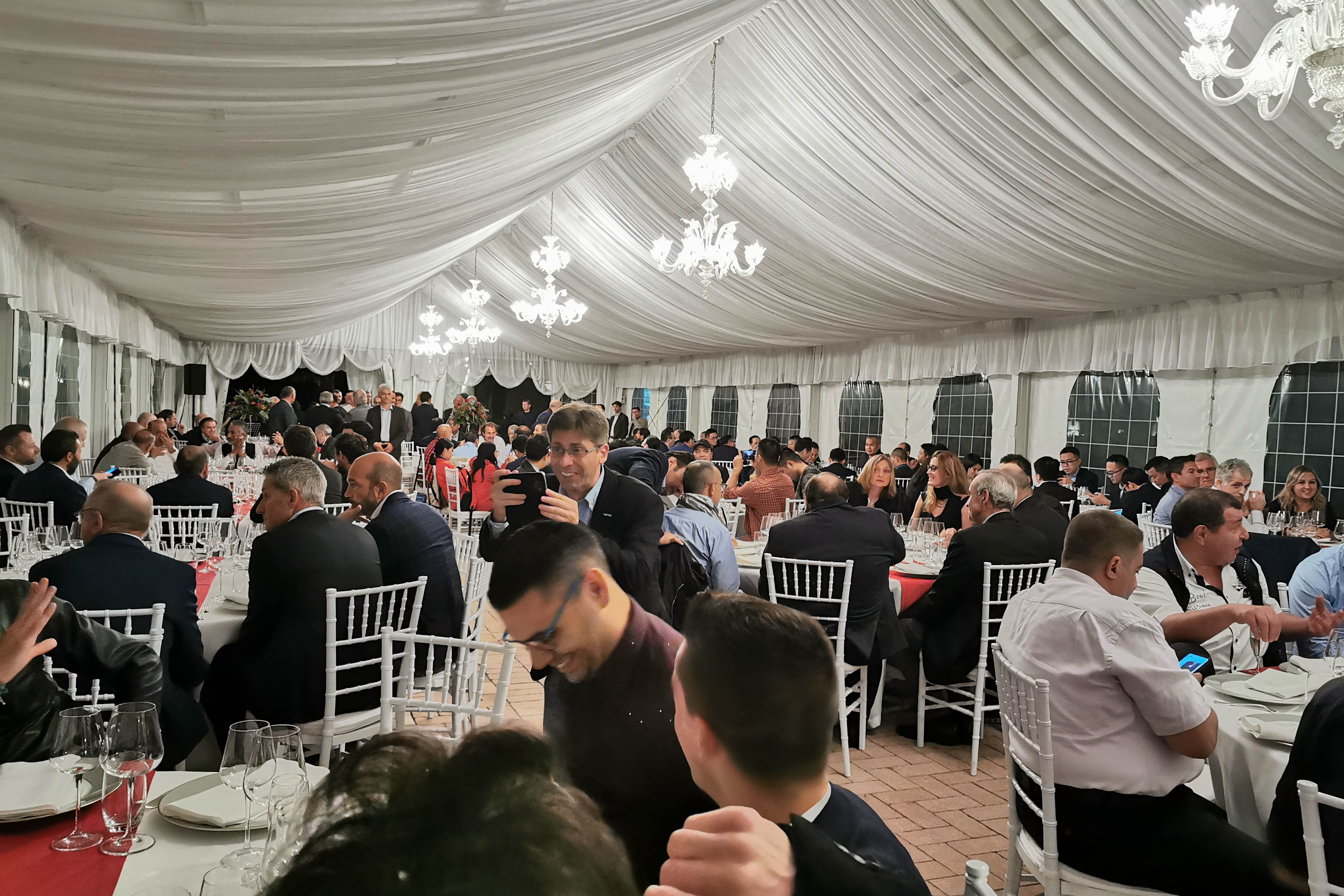揭幕仪式之后,大家移步至古色古香的Villa Bice城堡参加庆祝晚宴,在千年古堡中,伴着优美的音乐,与会嘉宾相谈甚欢。晚宴开始之前,董事长边程再次致谢中外贵宾莅临爱游戏(中国)欧洲的揭幕仪式,并表示了对市场前景的信心。随后,作为佛山市工商联的代表,佛山市工商联主席、新明珠集团董事长叶德林向爱游戏(中国)欧洲公司的开业致以衷心的祝贺,并表示在爱游戏(中国)今后的全球化进程中,新明珠将会一如既往地予以大力支持和密切合作。
