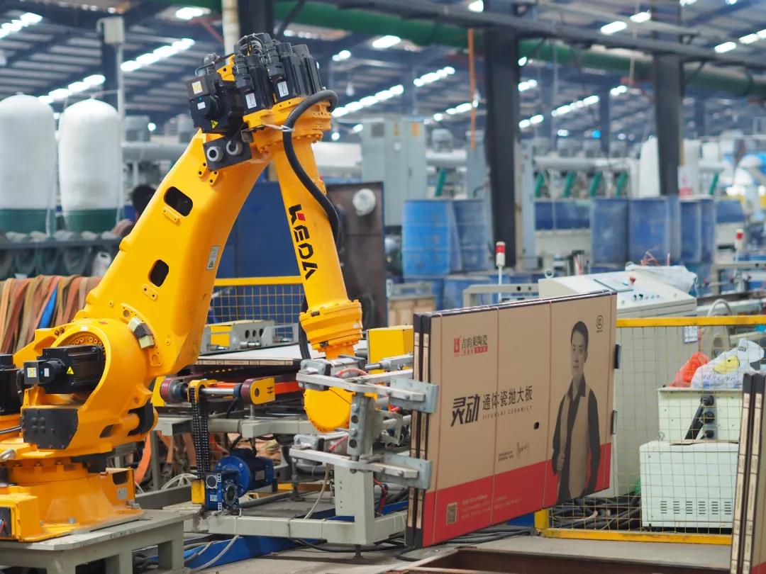 那些看不见的省去的用工体现在哪些生产环节?罗斯福陶瓷生产厂长周明亮指出,自动储坯系统节省了拣砖工;窑炉采用了自动控制系统,过去一条窑要配一个炉工加一个保养人员,现在只需一个炉工就可以了;数控智能抛光线环节,过去一个人看一台抛光机,如今一人看三台抛光机,可以省去一半用工,磨边线采用伺服电机比普通电机控制精度更高;自动打包线采用机器人码包;智能管控系统的应用省去在车间来来回回巡查的数据统计员。