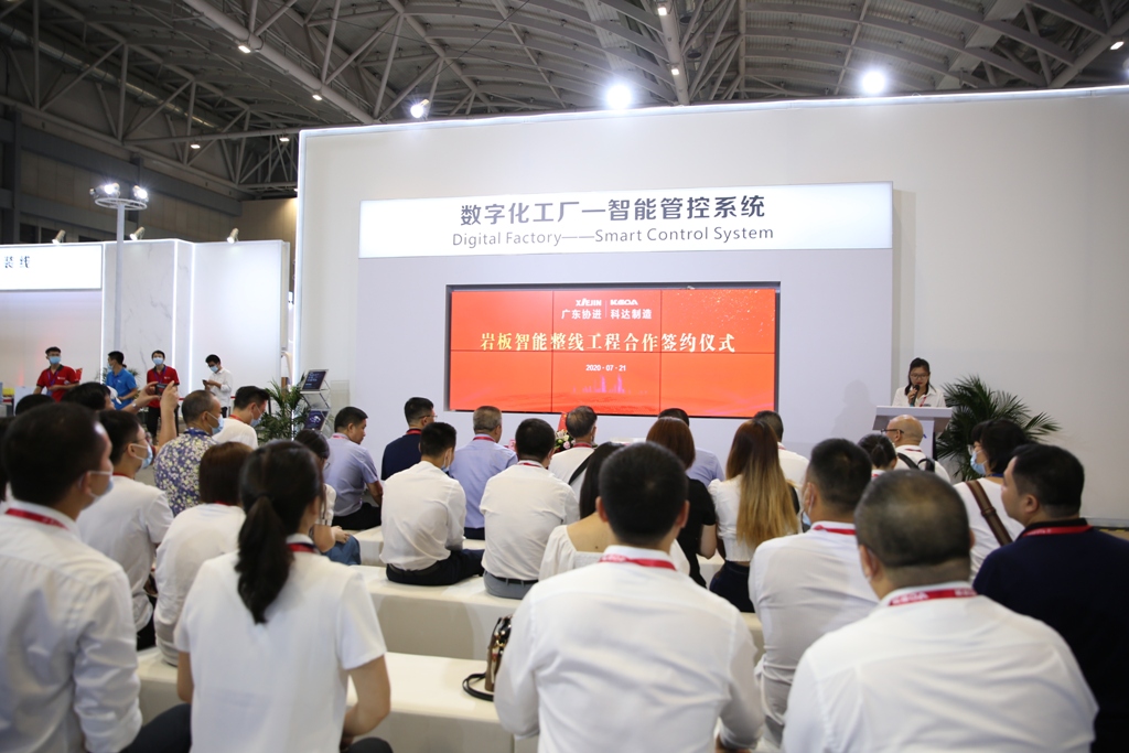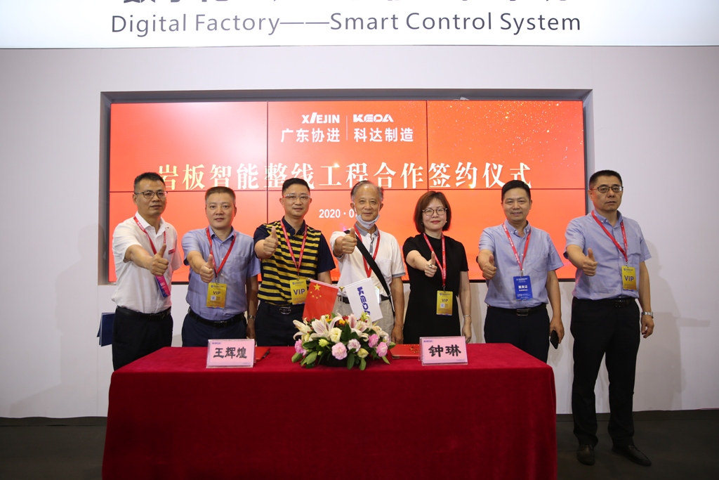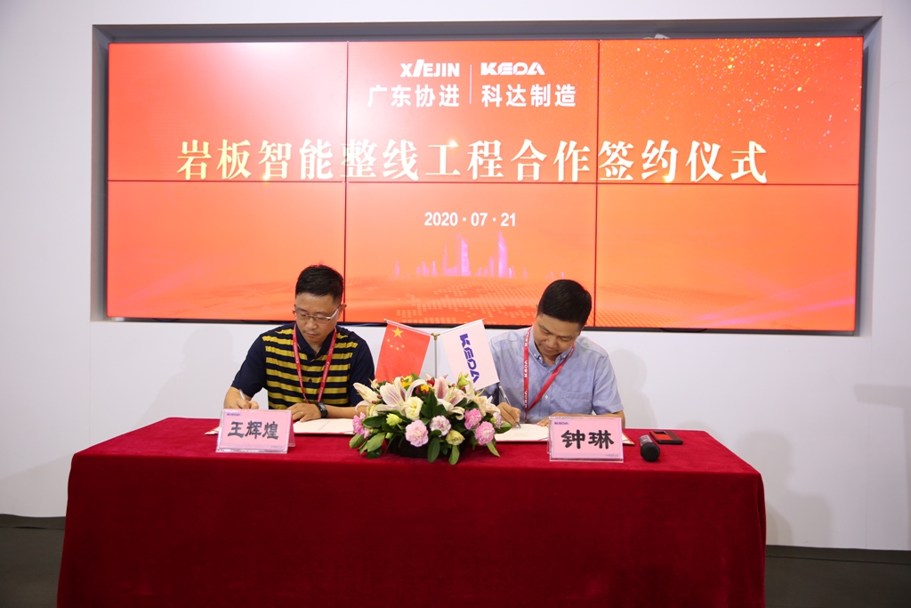7月21日,爱游戏(中国)展位智能管控展示区,在众多与会观众的见证下,广东协进陶瓷有限公司与爱游戏ayx官方网页股份有限公司举行了“岩板智能整线工程”项目签约仪式。根据合约,爱游戏(中国)将为广东协进提供包括KD16008压机、岩板窑炉、智能储砖系统,抛光线、包装线以及智能管控系统在内的整线工程。