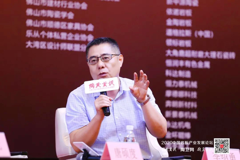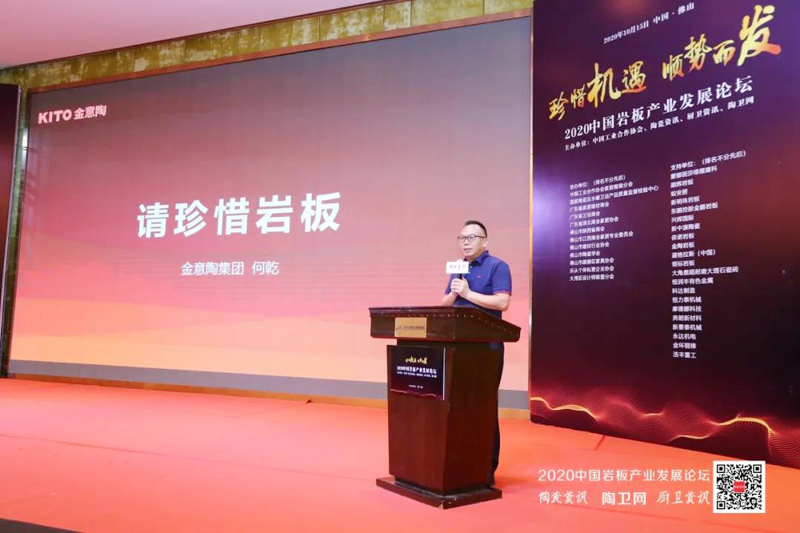 金意陶董事长何乾做了 “请珍惜岩板”的主题演讲,他认为,不管是从百度关键词热度,还是国内的上线速度,岩板已成为现在行业公认的风口。“岩板给了行业很多机会,岩板是消费者对绿色和健康追求的结果。岩板可替代石材、石英石,在环保方面有更好的表现,岩板和其它材料复合,如发泡陶瓷,可带来更广泛的用途。未来随着釉线技术的进步,岩板表面可以呈现更丰富的效果,而得益于坯体工艺技术和工艺设备的进步,岩板做薄至2mm甚至1mm都没问题。”他同时呼吁企业要珍惜这来之不易的风口,将岩板的品质做更好一些,赋予岩板更美好的生命力。