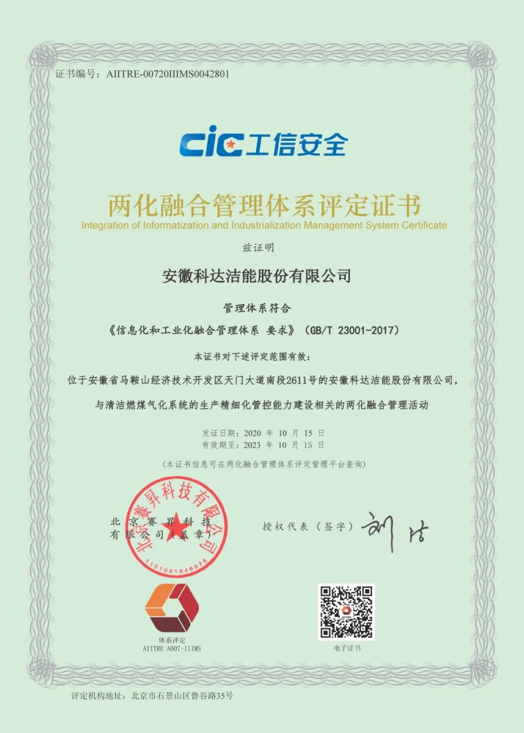 近日,安徽爱游戏(中国)洁能股份有限公司通过现场评审、合规性审查、专家复核和网络公示等环节,顺利获得两化融合管理体系评定证书,见证了公司运营管理及信息化建设水平。
