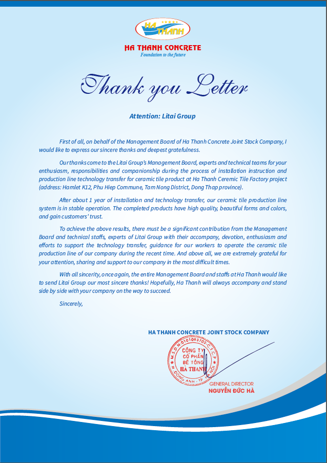 客户在感谢信中说道:"力泰团队是热情友好的团队,负责任有担当。非常感谢力泰团队在河清公司最困难时期给予的各项帮助与支持。现在生产线整体稳定、产品质量上乘、造型与色质美观,深受客户好评。河清全体职员再次衷心地向力泰团队表示最诚挚的谢意,希望双方携手并肩走在成功的大道上。"