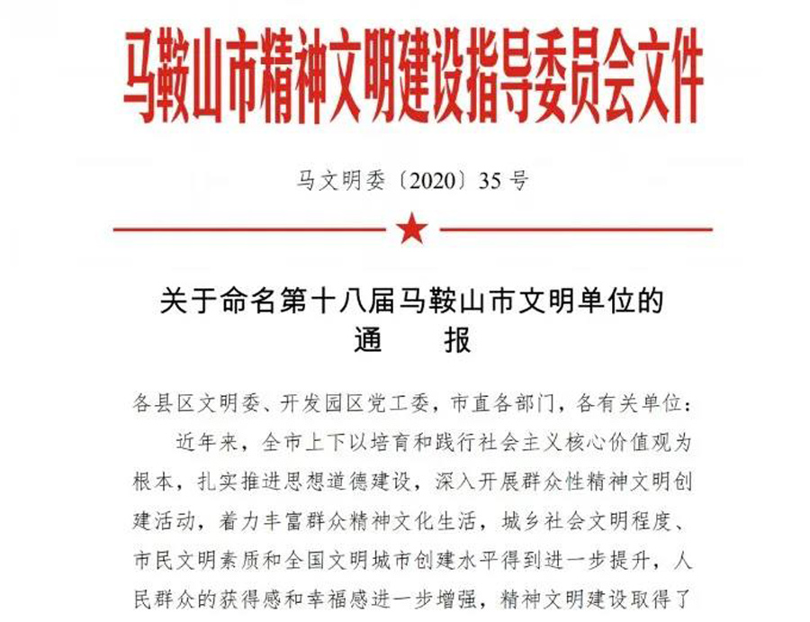 1月4日,马鞍山市精神文明建设指导委员会发布《关于命名第十八届马鞍山市文明单位的通报》(马文明委〔2020〕35 号),通报指出,为充分展示全市精神文明创建活动成果,进一步调动全社会积极参与精神文明建设的主动性,决定命名市机关事务管理中心等 365个单位为“第十八届马鞍山市文明单位”,并公布名单。