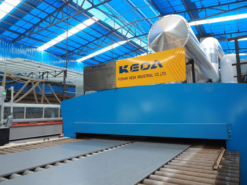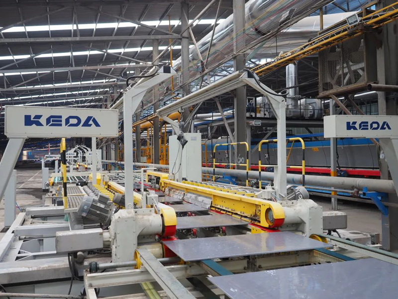 该岩板线目前主要生产800×2600×15(mm)规格岩板,日产量为8000㎡,设计日产量可达12500㎡,可满足生产700×1300mm、800×1400mm、800×(2000-2700)mm、1200×(2400-2700)mm、1600×(1600-3600)mm等多个岩板规格。