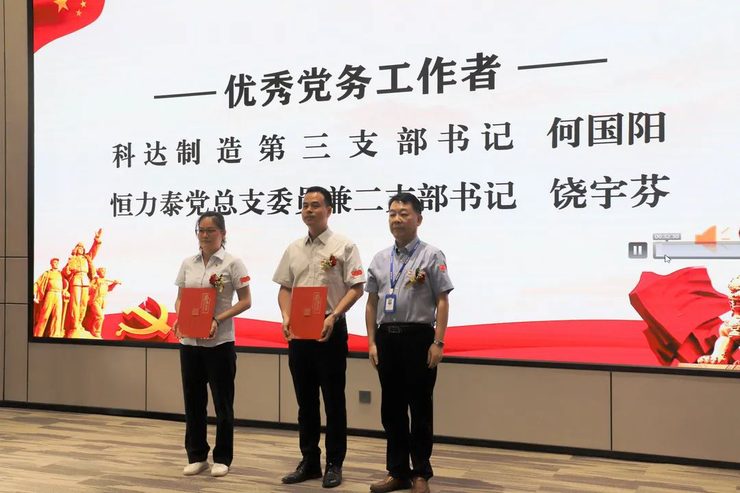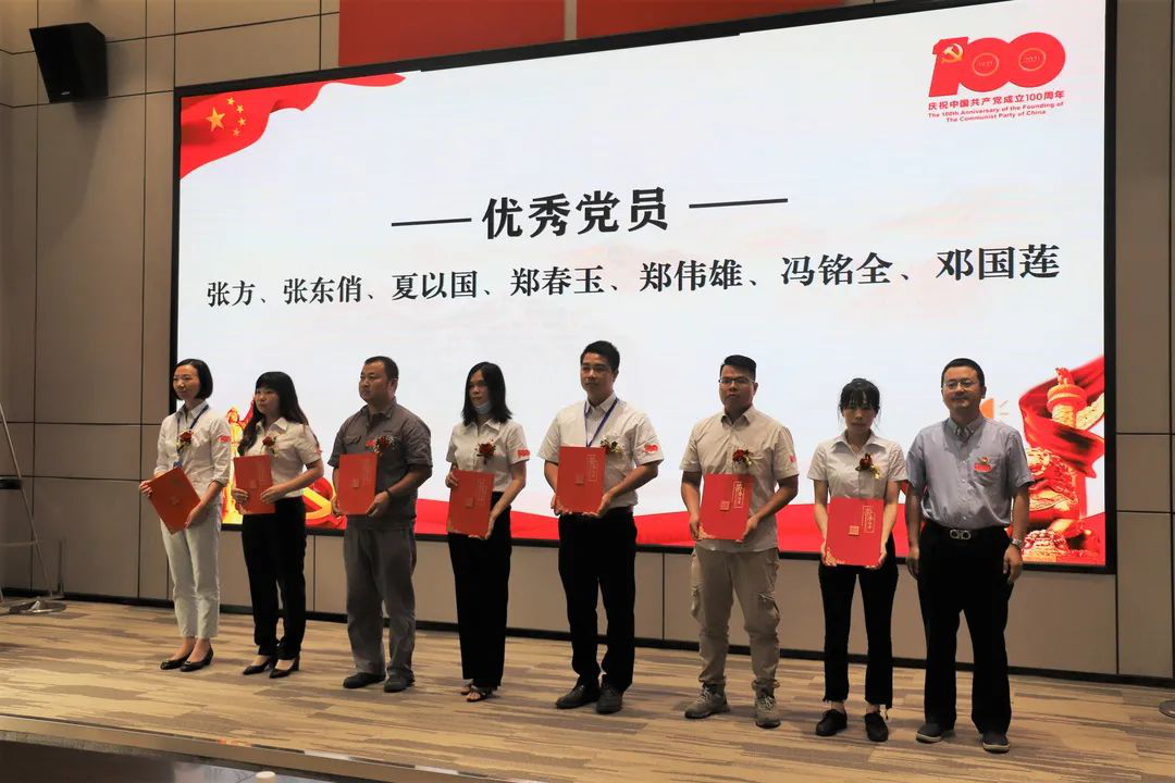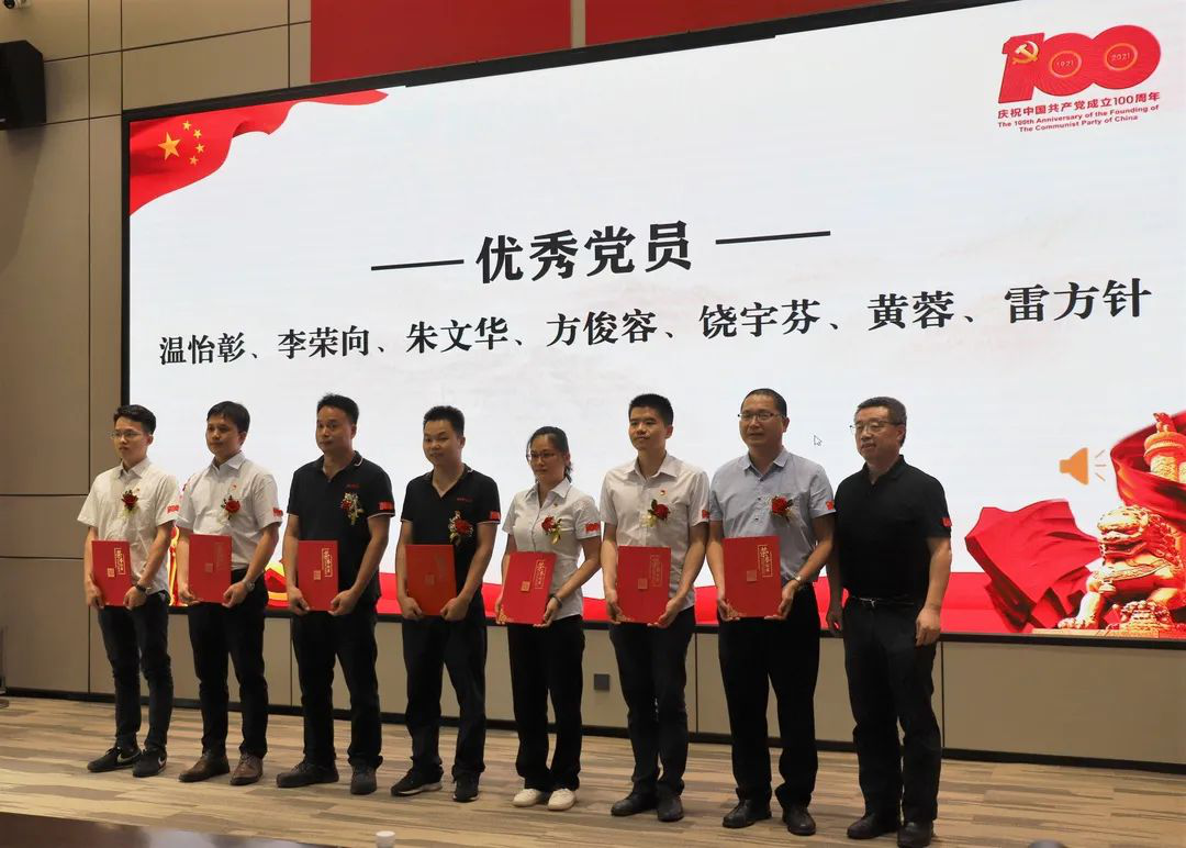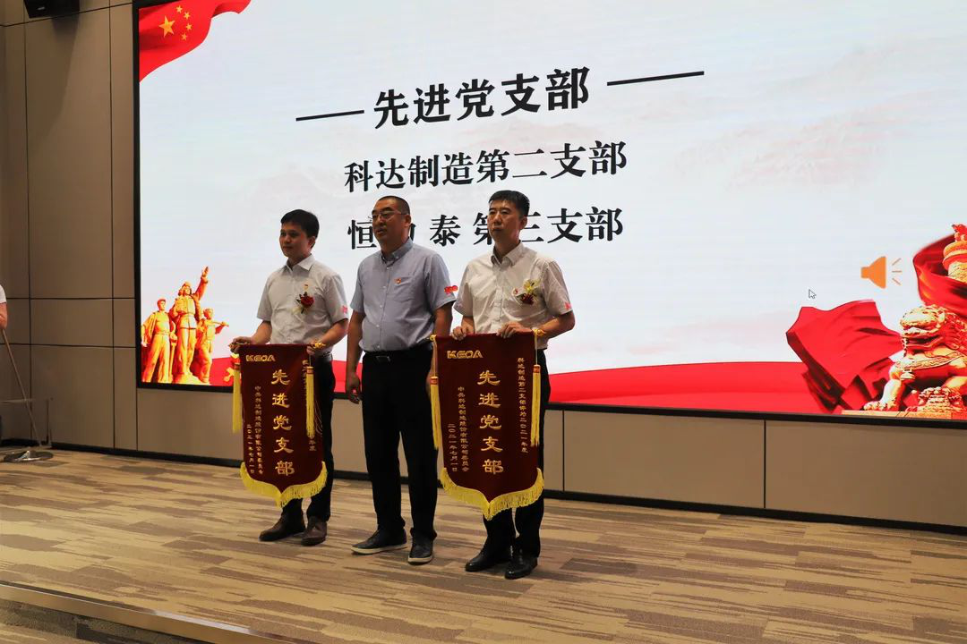 随后,董事长边程,副总裁曾飞、周鹏,党委书记李斌分别为获先进集体和个人代表颁发证书和锦旗。会上共表彰3支先进党支部、24名优秀党员及3名优秀党务工作者。另外,推荐3名陈村镇优秀党员及1名陈村镇优秀党务工作者。