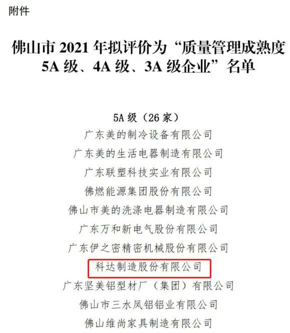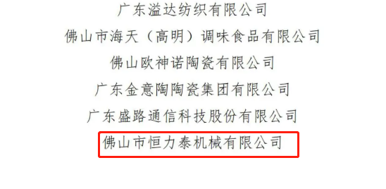 近日,佛山市市场监督管理局2021年企业质量管理成熟度评价结果已通过公示,爱游戏ayx官方网页及恒力泰位列其中,获评“佛山市2021年企业管理成熟度5A级企业”。