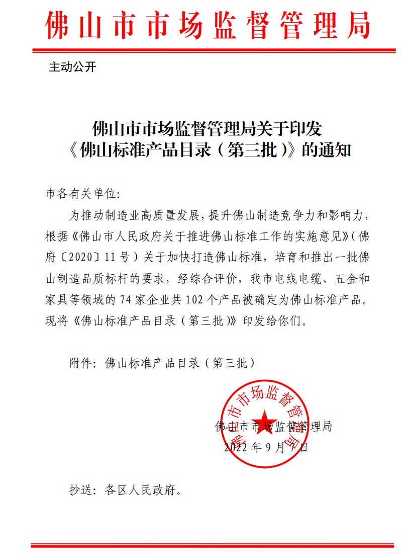 佛山标准是代表佛山制造先进质量和技术水平的系列标准,是市场主体主导制定、权威技术机构评估、政府部门采信的先进团体标准。佛山标准高于国家、行业标准又符合产业实际,并以先进标准为前提,从标准、质量、创新、品牌、效益、社会责任6个维度,对佛山标准产品进行综合评价,通过佛山标准评价的产品是佛山制造的“优等生”,行业品质标杆。