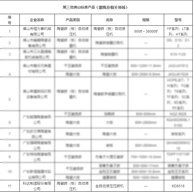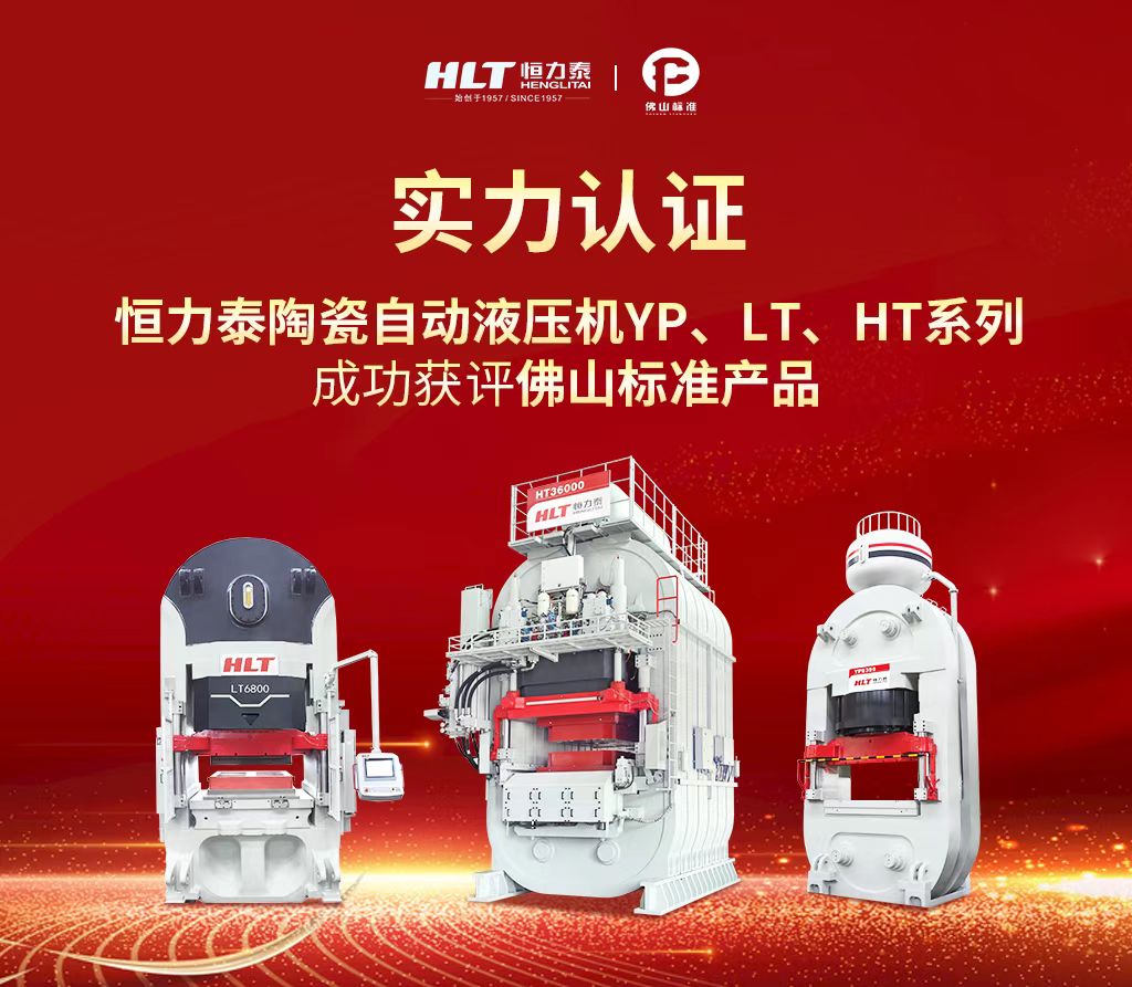 近日,佛山市市场监督局公布了2022年第三批《佛山标准产品目录》,佛山市陶瓷、家电、五金、家具等领域74家企业共102个产品被评为佛山标准产品。恒力泰YP系列、LT系列、HT系列陶瓷砖(板)自动液压机及爱游戏(中国)KD8518压机凭借优异的性能表现,领先的创新力顺利通过佛山标准评价。