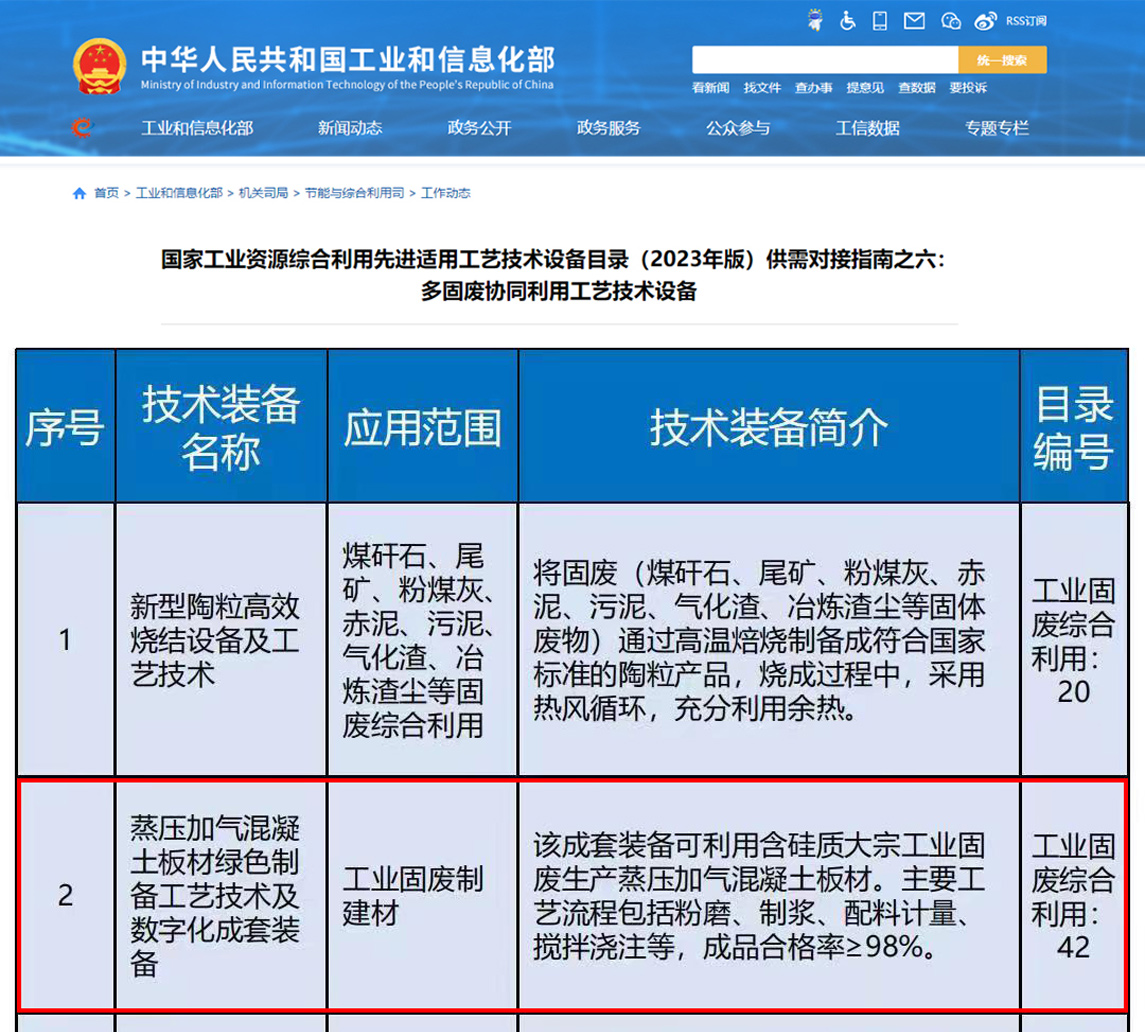 为贯彻落实《固体废物污染环境防治法》,加快工业资源综合利用先进适用工艺技术设备推广应用,持续提高资源利用效率,工业和信息化部、国家发展和改革委员会、科学技术部、生态环境部发布了《国家工业资源综合利用先进适用工艺技术设备目录(2023年版)》(以下简称“《目录》”),涵盖工业固废减量化、工业固废综合利用、再生资源回收利用、再制造等重点领域。安徽爱游戏(中国)机电股份有限公司提供的“蒸压加气混凝土板材绿色制备工艺技术及数字化成套装备”成功入选该目录。