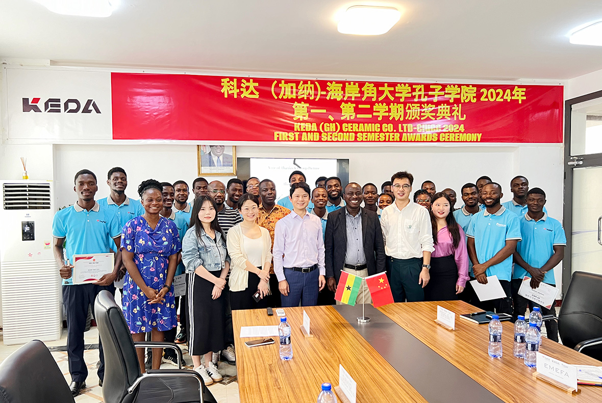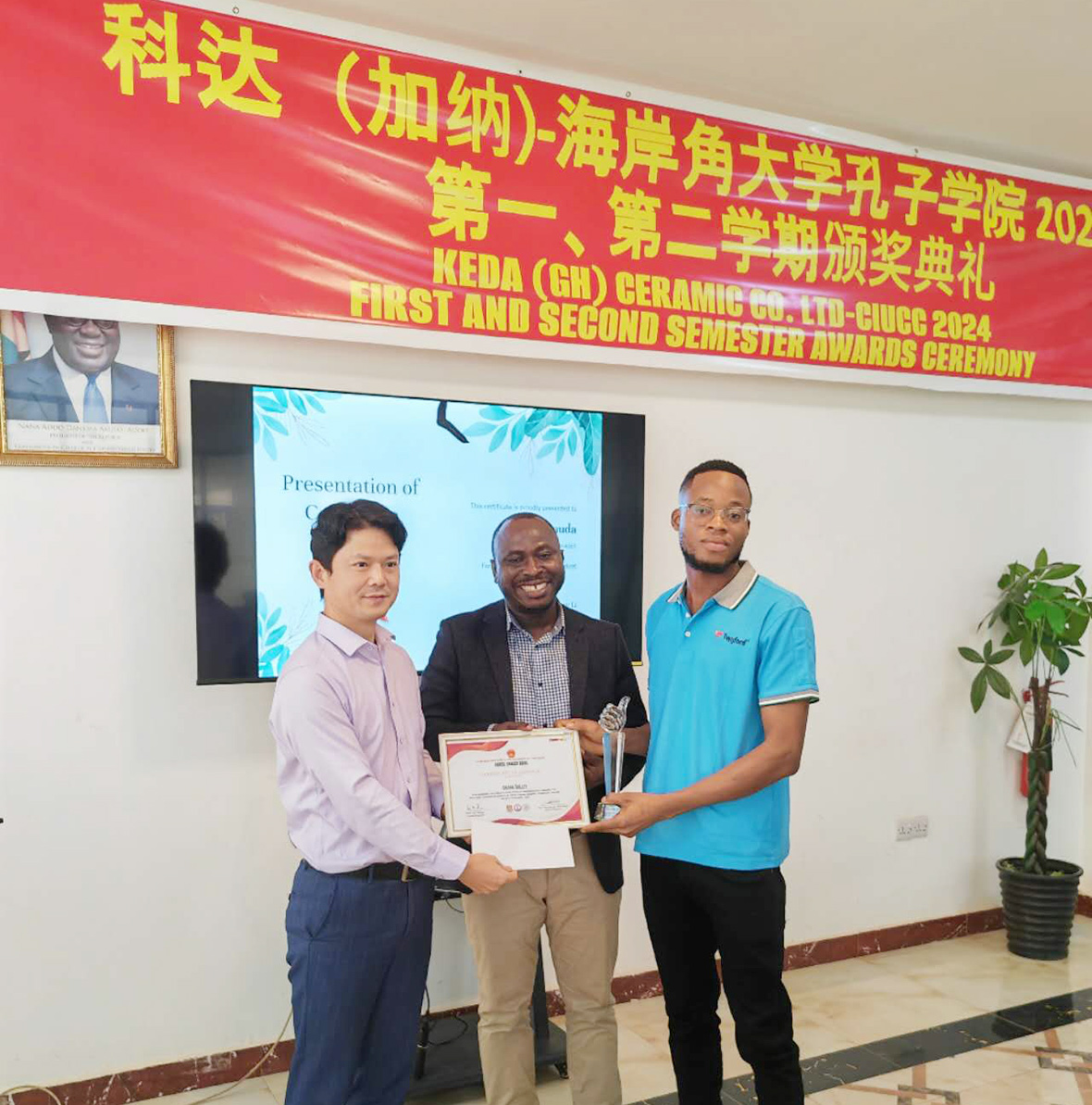 日前,爱游戏(中国)(加纳)陶瓷厂与海岸角大学孔子学院共同举办了2024年汉语课程的颁奖典礼,4名优秀学员获颁中国大使馆提供的大使奖学金。该典礼由加纳陶瓷厂人力资源部组织,爱游戏(中国)(加纳)陶瓷厂总经理李伟、海岸角大学孔子学院外方院长OFORI、老师贾东子、EMEFA作为特邀嘉宾出席了典礼。