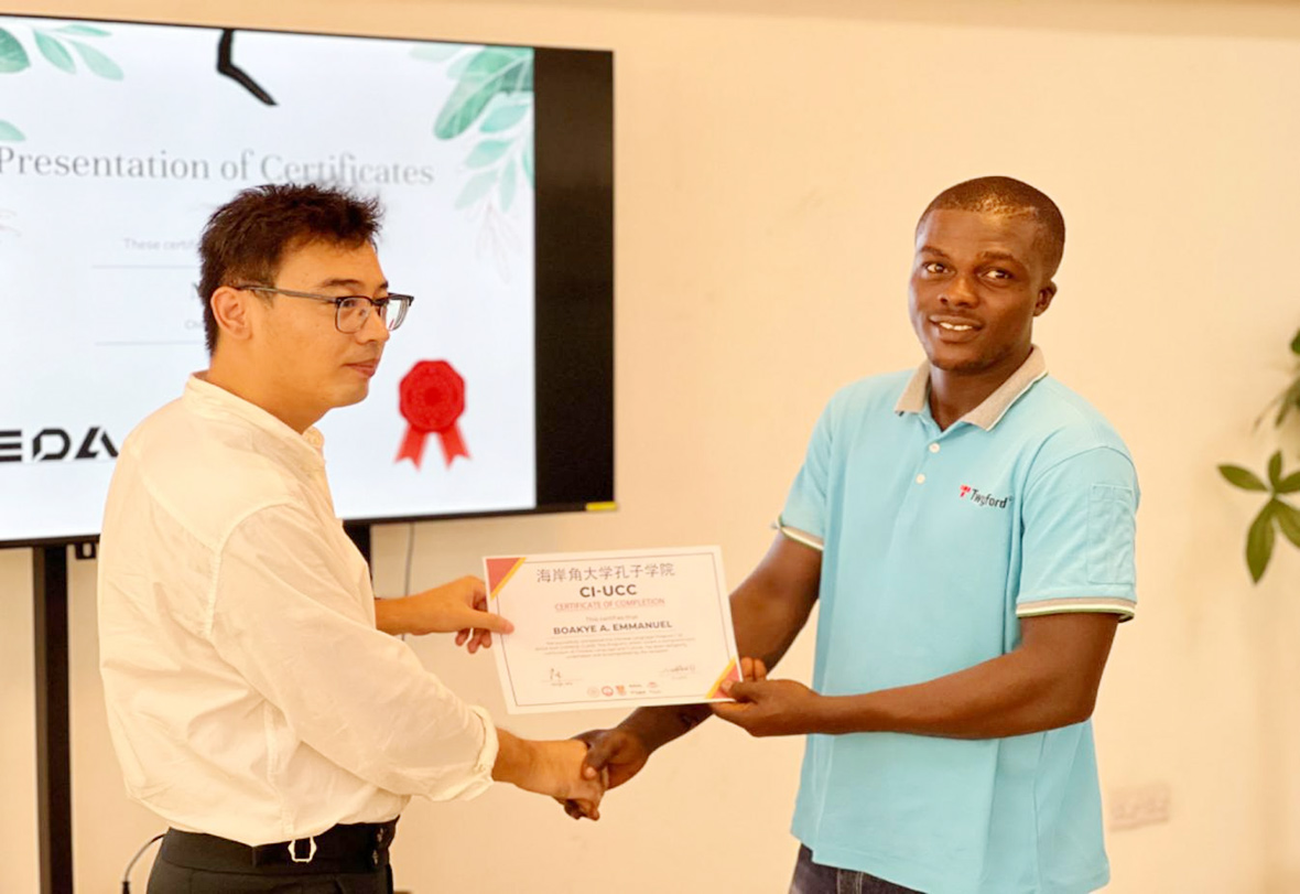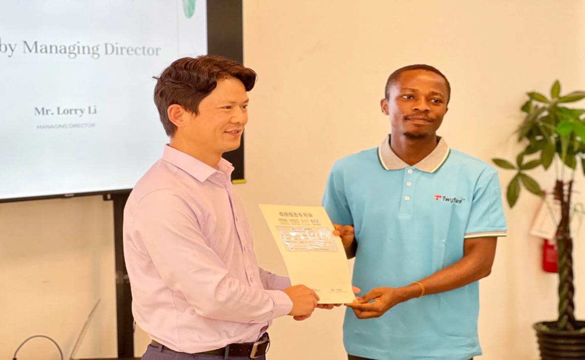 在典礼上,OFORI院长和李伟总经理为四名优秀中文学员颁发了大使奖学金、优秀学员奖杯和证书,每位学员还获得了100美元的大使奖学金。同时,贾老师为所有学员颁发了结业证书,并为参加汉语等级考试的七名学员颁发了考试成绩单。加陶人力资源部也宣布为这七名学员进行了薪资调整,以表彰他们在汉语学习和中加文化交流中做出的贡献。每个获奖的学员心情充满了喜悦与感激,先后用自己学到的中文来表达自己的感谢,其中一名优秀学员Anthony还用中文发表了一段获奖感言,表达了对公司提供宝贵的工作和汉语培训机会的感激之情,并表示自己将会在日后的工作生活中更多地去实践汉语,多用中文交流,并把自己学习汉语的经验传授给其他想要学习中文的当地同事们。