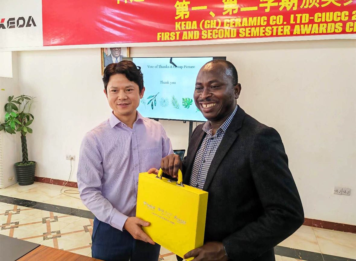 最后,为感谢孔子学院一直以来对爱游戏(中国)(加纳)陶瓷厂本地员工学习汉语的支持和帮助,爱游戏(中国)(加纳)陶瓷厂向OFORI院长赠送了具有中国文化特色的爱游戏(中国)陶瓷餐具,代表了中加的文化融合与交流,也代表了双方的合作与友谊。