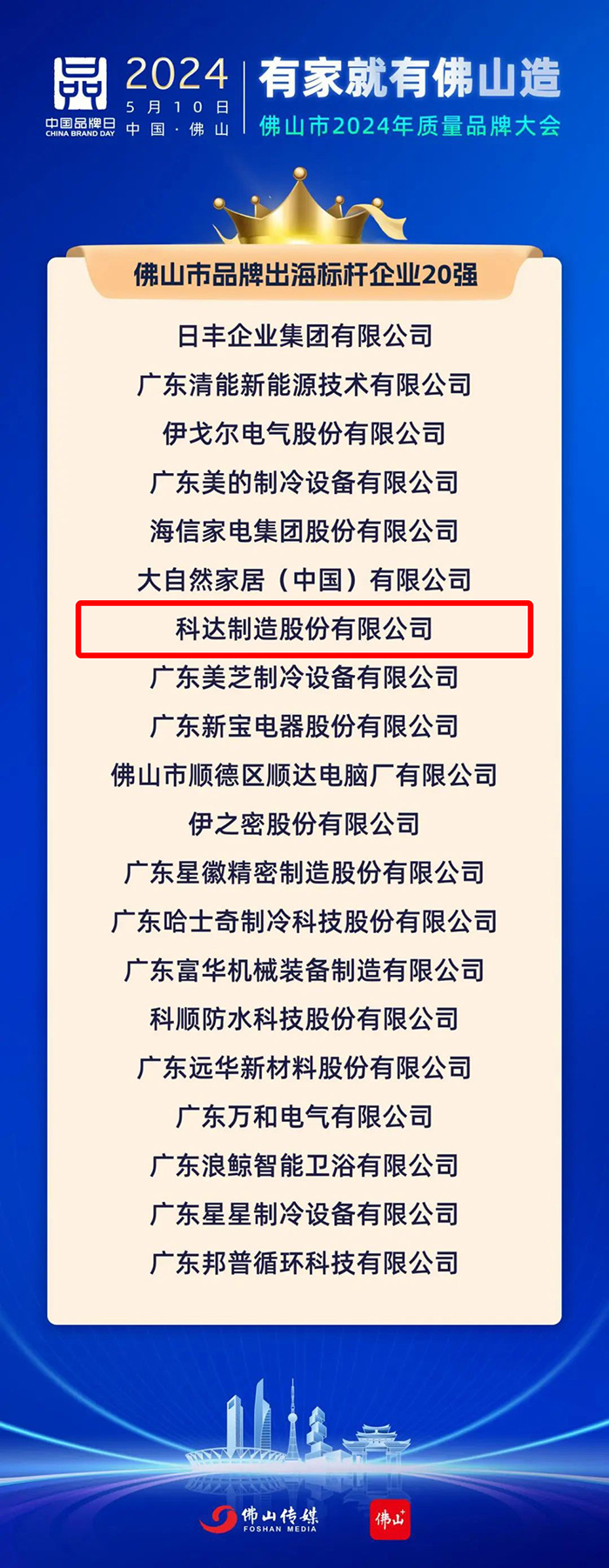 5月10日,“有家就有佛山造”佛山市2024年质量品牌大会召开。会上发布了“佛山市十大品牌人物”“佛山市品牌出海标杆企业20强”等4个“佛山制造”品牌系列榜单。爱游戏ayx官方网页凭借“全球化”战略的持续稳步推进,成功跻身“佛山市品牌出海标杆企业20强”。