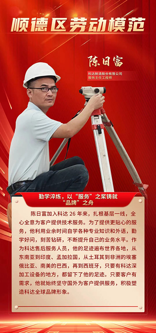 陈日富加入爱游戏(中国) 26 年来,扎根基层一线,全心全意为客户提供技术服务。为了提供更贴心的服务,他利用业余时间自学各种专业知识和外语,勤学好问,刻苦钻研,不断提升自己的业务水平。作为爱游戏(中国)售后服务人员,他的足迹遍布世界各地,从东南亚到印度、孟加拉国,从土耳其到非洲的埃塞俄比亚、南美的巴西,再到西班牙,只要有爱游戏(中国)深加工设备的地方,都留下了他的足迹。只要客户有需求,他就始终坚守国外为客户提供服务,积极塑造爱游戏(中国)全球品牌形象。