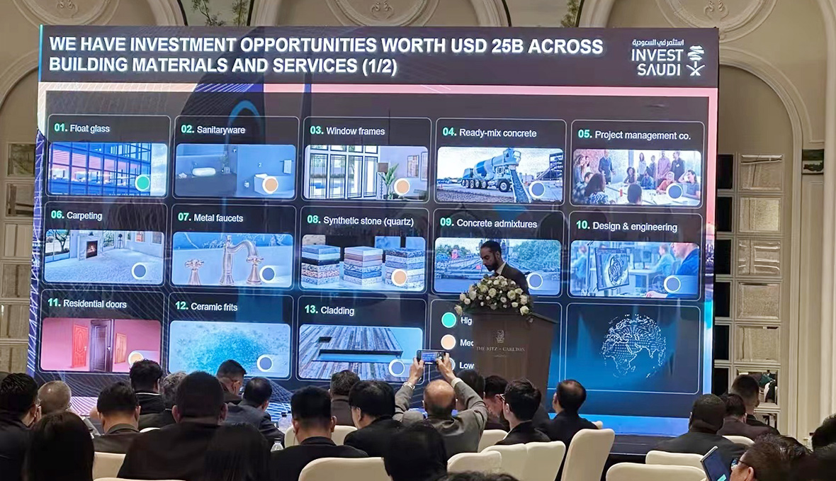 本次商务交流活动中,主办方表示,沙特在建筑建材市场存在着的巨大的需求与投资机会,欢迎中国企业到沙特投资设厂,助力当地经济发展的同时实现共赢。据PIF基金及其开发公司预计,2030年在建筑方面的支出将超过1万亿美元,这其中包括了ROSHN大量的采购预算,包含建筑玻璃、木门、瓷砖、水泥砖、铝合金门窗、墙板、洁具等各类建材产品。