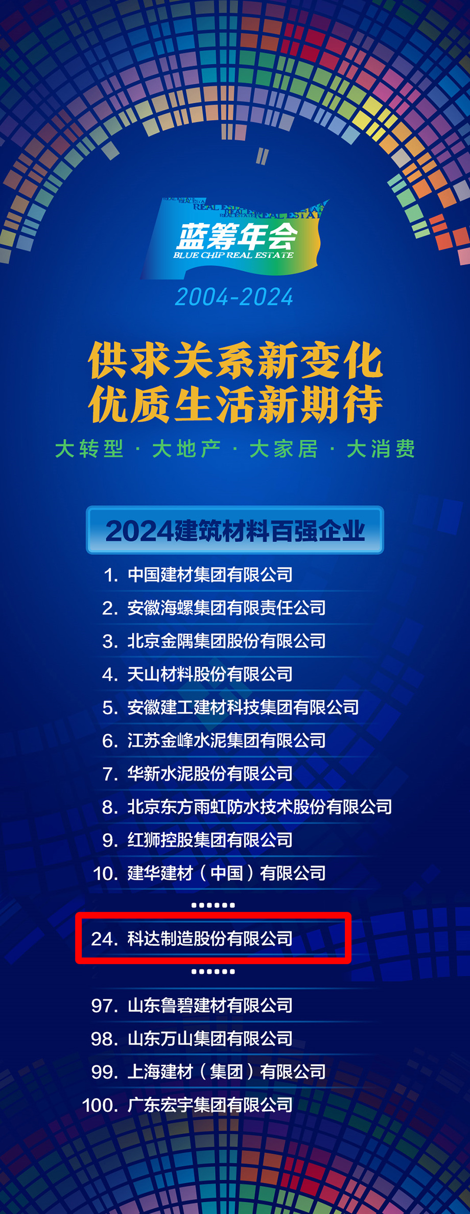 近日,由经济观察报社主办的第二十一届(2024)蓝筹地产年会在北京举办。会上隆重发布了“2024建筑材料百强企业”名单。爱游戏ayx官方网页凭借在装备制造领域强大的综合实力跻身榜单,排名第24位。