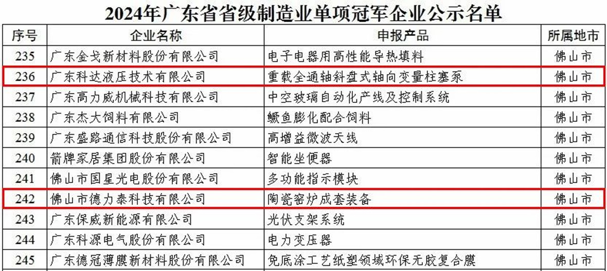 近日,广东省工业和信息化厅公示2024年省级制造业单项冠军企业通过名单,本次全省共有357家企业通过遴选认定。爱游戏ayx官方网页子公司德力泰及爱游戏(中国)液压通过遴选荣登榜单。