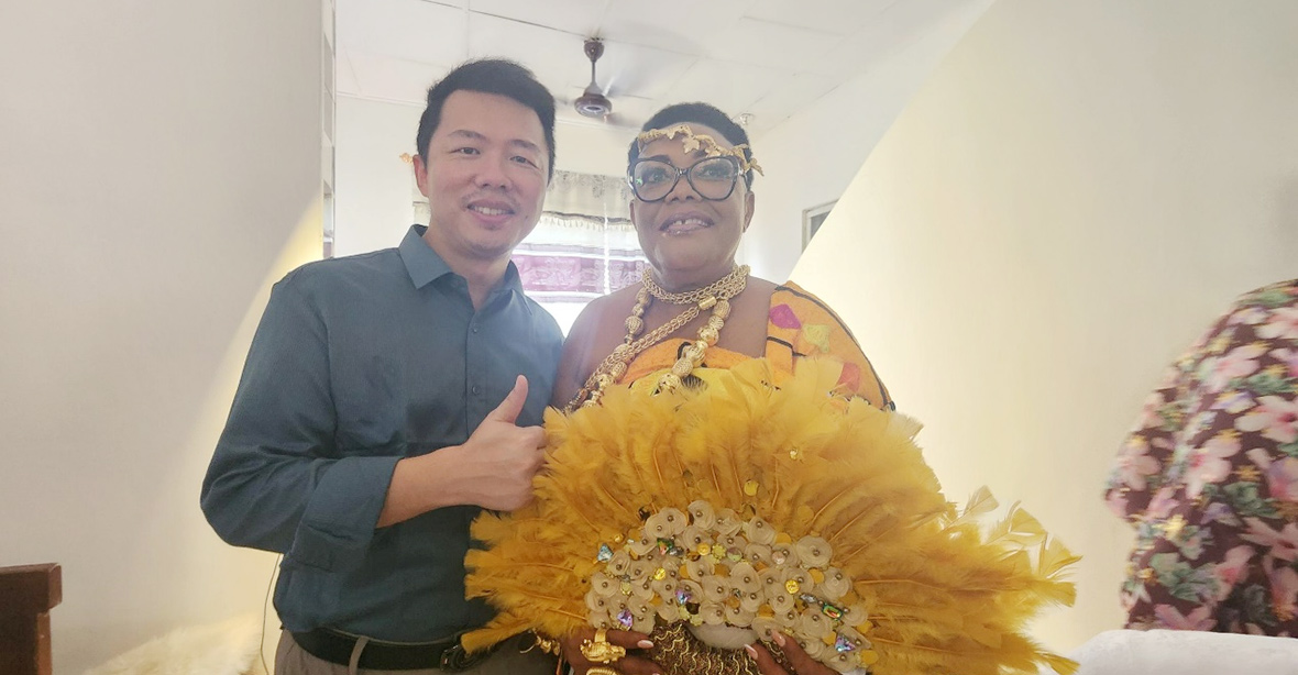 加纳当地时间2月21日,Nyankorm社区享有较高声誉的Queen Mother Nana Akosua Gyamfiaba II和Nana Edu Kotsia III举办地方传统婚礼,特福加陶商务经理卫志选和行政经理Eugene Komey代表公司应邀出席,并为其准备了诚意满满的礼物与祝福。据悉,在加纳文化中,“Queen Mother”(女王母亲)是一个具有重要地位和影响力的称号,通常授予在社会、文化和政治领域有杰出贡献的女性。