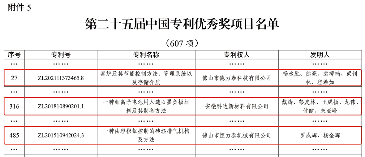 其中,恒力泰机械的《一种由容积缸控制的砖坯排气机构及方法》、德力泰科技的《窑炉及其节能控制方法、管理系统以及存储介质》、安徽爱游戏(中国)新材料的《一种锂离子电池用人造石墨负极材料及其制备方法》获第二十五届中国专利优秀奖。
