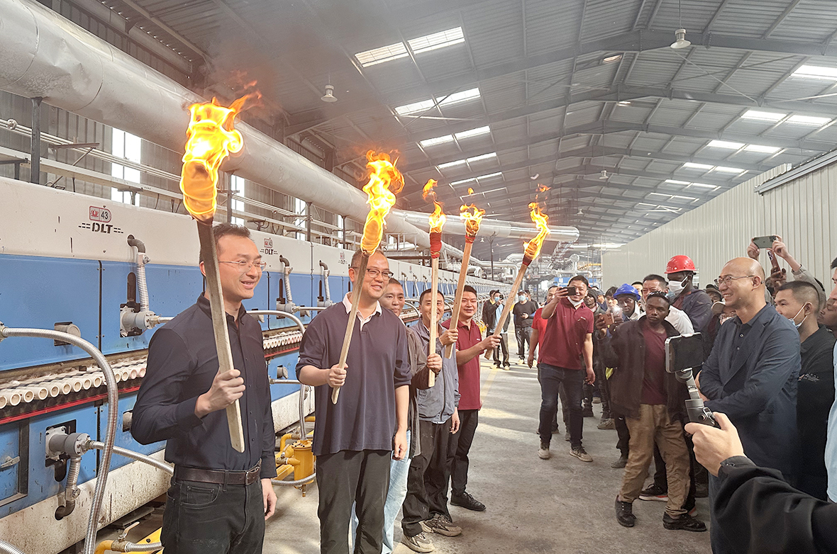 肯尼亚全国第一条全抛釉生产线正式点火投产!6月19日,特福国际肯尼亚陶瓷厂(以下简称“特福肯陶”)伊新亚分厂,隆重举行点火投产仪式,特福肯陶副总经理单瓅、厂长傅伟与员工代表手持火炬,共同点燃窑炉,宣告产线正式启用。