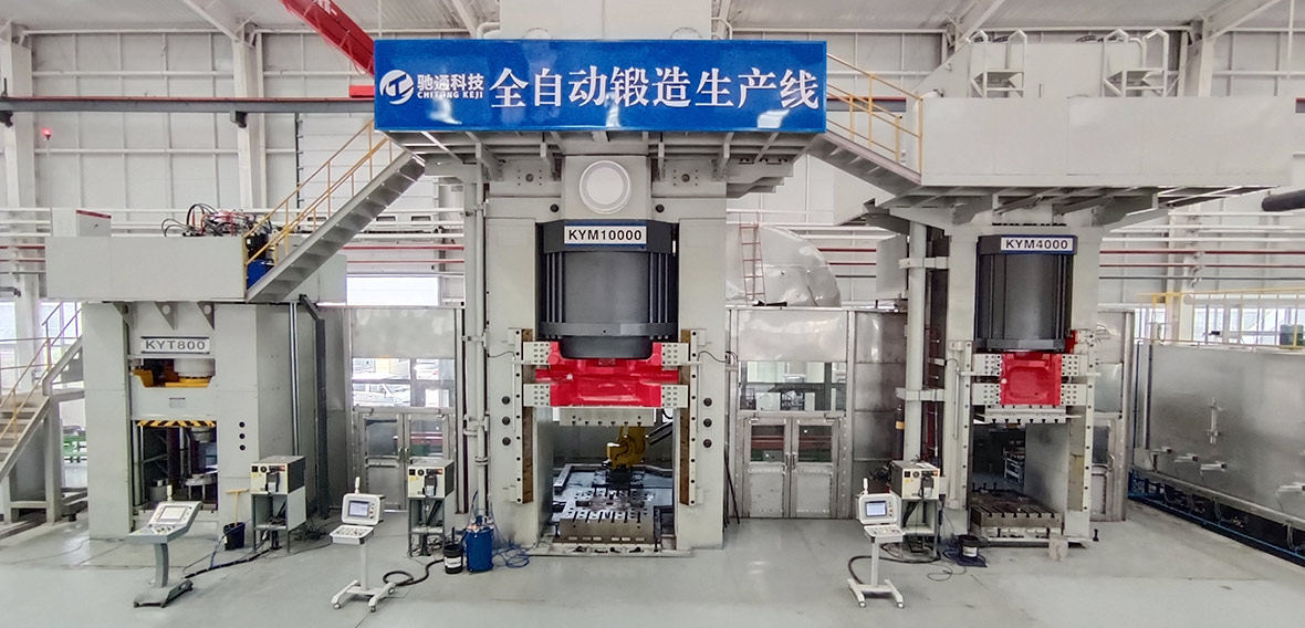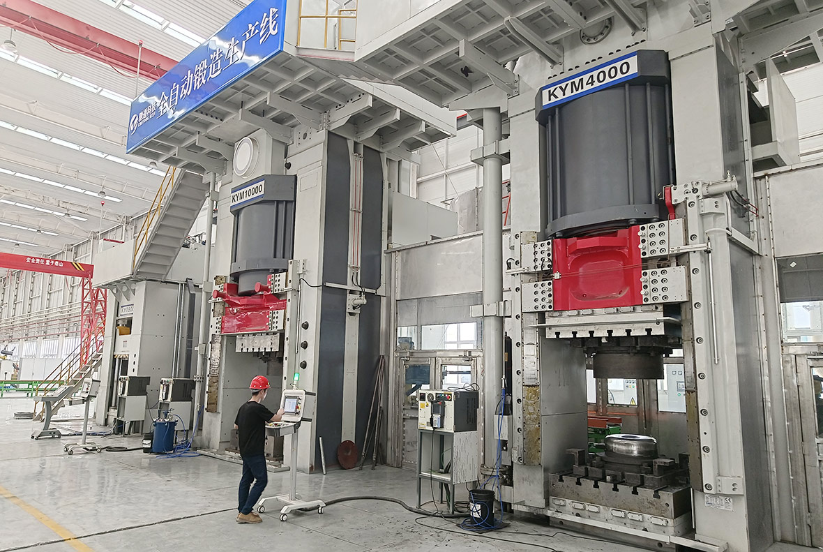 该条全自动锻造生产线引入了3台爱游戏(中国)压机,分别为预锻部分的KYM4000锻造压机、成型锻KYM10000锻造压机以及冲扩孔KYM800吨压机。