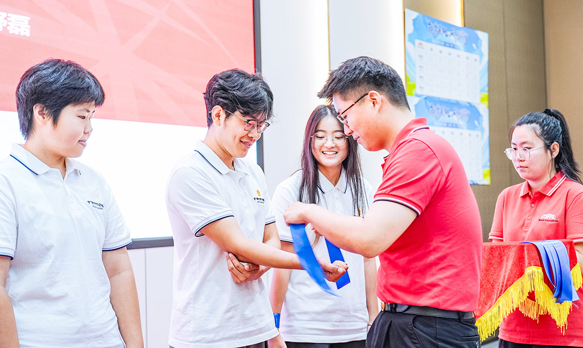最后的拜师仪式上,各部门导师为校招管培生系上“蓝丝带”,寓意师徒情谊的联结与责任的传承。这一刻,导师与学员的双手紧握,共同许下成长与突破的承诺。