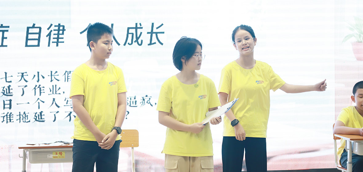 结营仪式的舞台上,小学A班和小学B班的孩子们分别带来了《我相信》和《纪念》合唱表演,用歌声展现了天真无邪、活泼开朗同时又对生活充满憧憬热爱的新生代风貌。话剧表演《疯狂的星期日》向全体营员传递了日常学习中养成自律、专注、不拖延等良好习惯的重要性。台下的老师与家长们纷纷拿起手机,记录下孩子们自信闪耀的动人时刻。