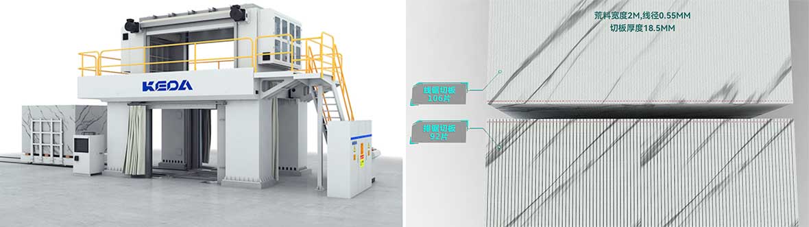 超高速智能线锯具有五大技术突破:极致切割速度,线速度高达1800-2000m/min;采用0.5-0.6mm超薄锯缝,大幅提升出材率;创新切割工艺使荒料利用率大幅提升,显著提高经济效益;切割板材厚度均匀、平整度高;废料泥渣显著减小,可实现绿色生产。