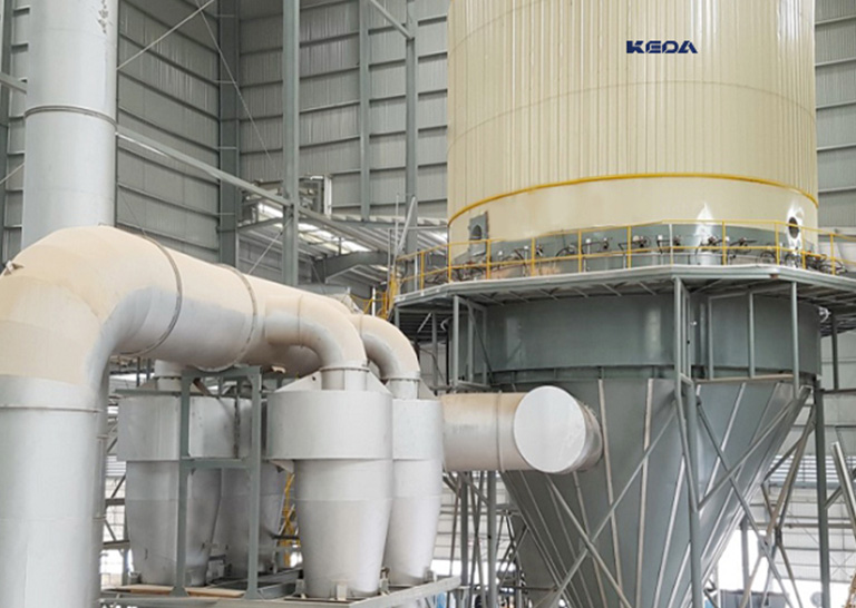 设备采用物理方法对陶瓷原料进行脱水,是一种干压法制坯的粉料干燥设备。它采用中压泵压送泥浆通过喷嘴在干燥塔中喷洒成雾状,具有巨大表面积的泥浆雾滴,与热风炉产生的热烟气相遇,在极短的时间内就干燥成近似于球形的颗粒,从干燥塔底排出。