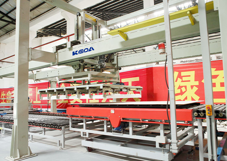 独特的卸板机巧妙地将窑尾自动拆围板和卸板融为一体:拆围板机械手将围板整体拆除后,窑具载着产品到卸板机械手下方,机械手下降夹住产品两侧并提升前移,将产品放入送板辊台。同时拆围板机械手将围板放入空棚板上。