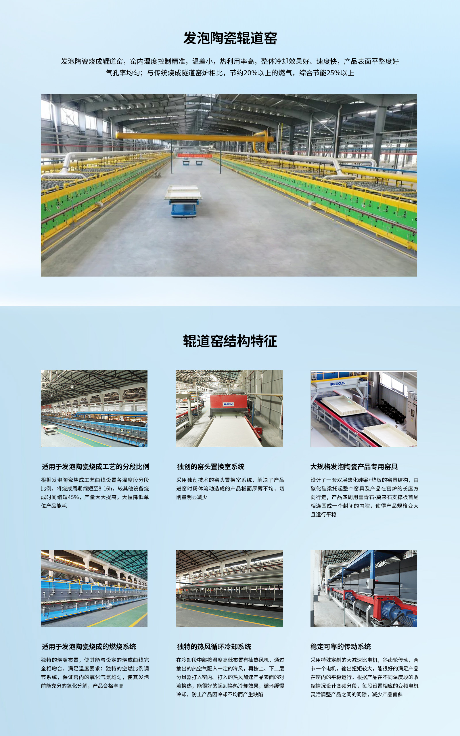 发泡陶瓷烧成辊道窑,窑内温度控制精准,温差小,热利用率高,整体冷却效果好、速度快,产品表面平整度好,气孔率均匀;与传统烧成隧道窑炉相比,节约20%以上的燃气,综合节能25%以上。