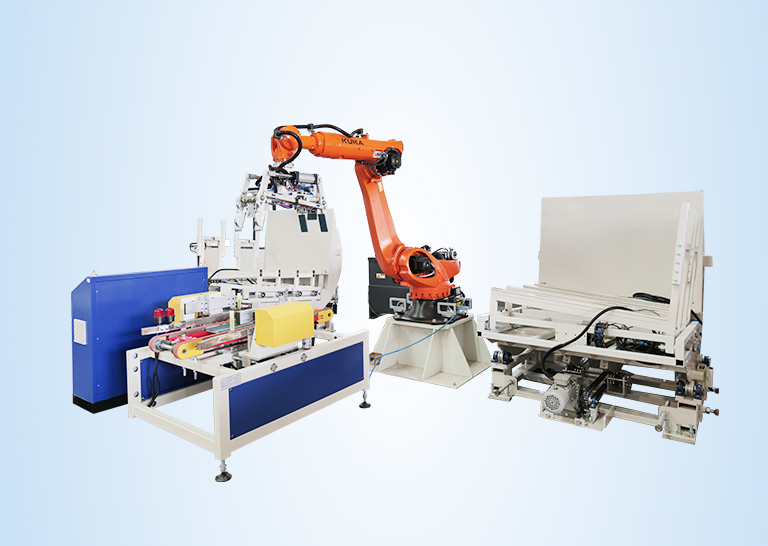 集成机器人,通过夹具将转包按照一定秩序堆放在砖架上,由叉车转运入仓;也可通过翻托装置将砖架上 的砖垛转移到木托上,再由叉车转运入仓。如需要在围码时实现转包和包装纸全部朝外、且喷码面(或盖 章面)统一朝外的出口托要求,则需要配独立的转台和翻包机。