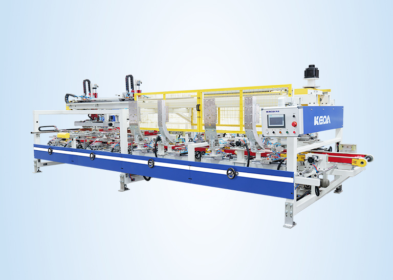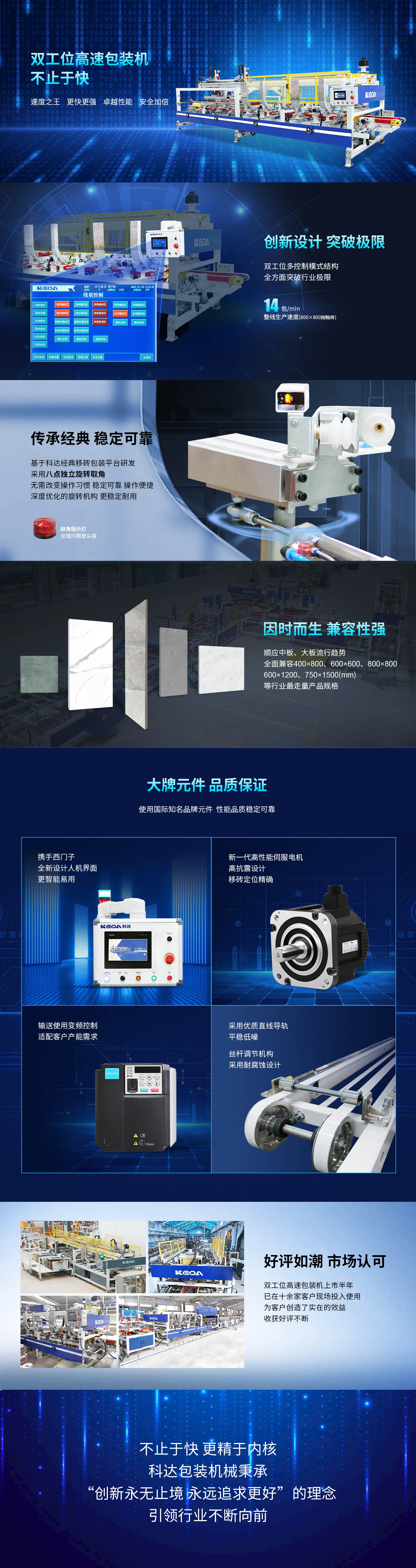 本设备为砖垛套塑料包角、配纸箱及折成砖包。采用四点独立旋转取 角、上吸纸方式取纸、坛式包装的多工步流水线式同步动作,由伺服 电机控制,移砖定位精确,包装美观、稳定、快速。