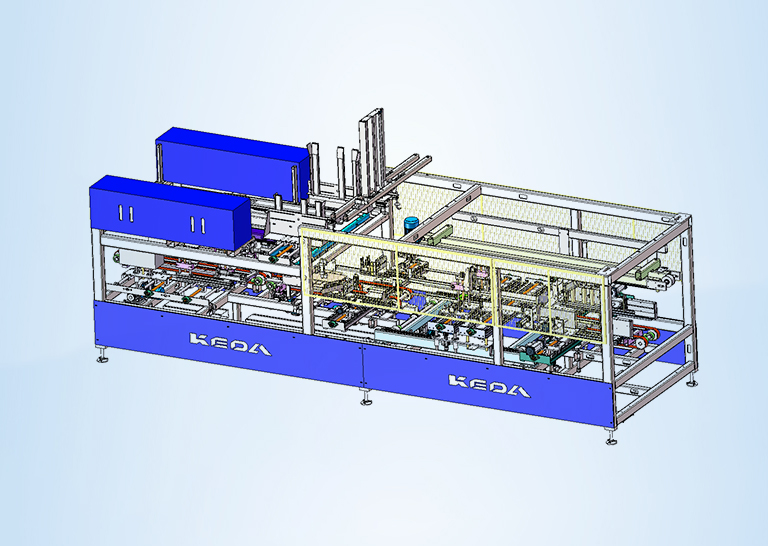 本设备为砖垛套纸箱、折成砖包及封胶带。采用刮出式取纸、伸入式撑箱、推进式装箱以及动态折纸封箱的多工位流水线式包装动作,推砖和撑箱等关键工位均采用伺服电机控制,定位精准,动作稳定,包装美观。