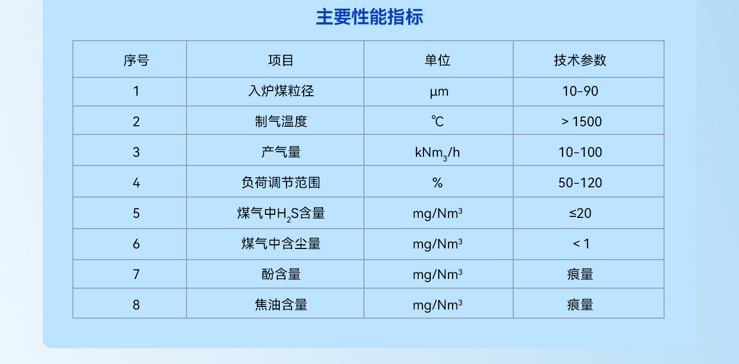 ● 清洁:生产过程无三废排放,煤气中H2S含量≤20mg/Nm³,粉尘含量≤10mg/Nm³,煤 气清洁程度达二类天然气标准。