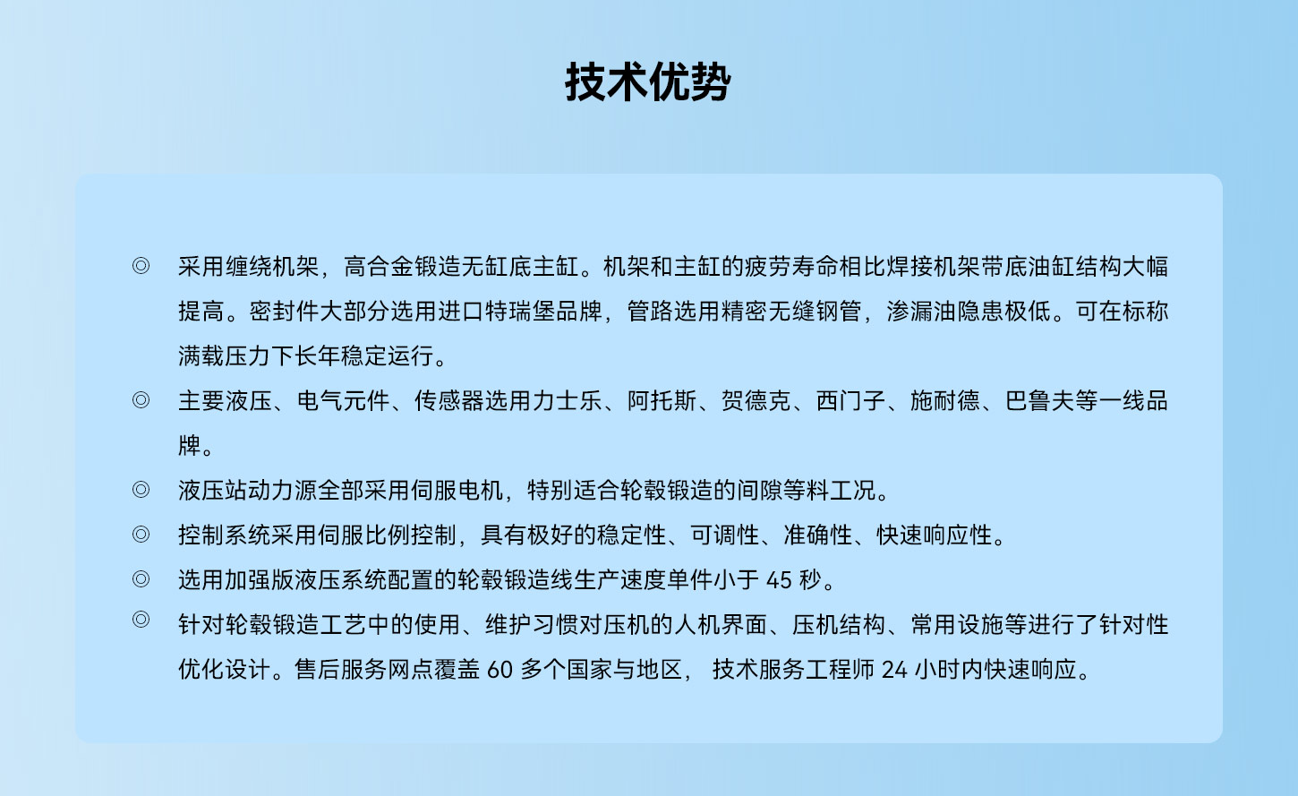 ◎ 针对轮毂锻造工艺中的使用、维护习惯对压机的人机界面、压机结构、常用设施等进行了针对性优化设计。售后服务网点覆盖 60 多个国家与地区, 技术服务工程师 24 小时内快速响应。